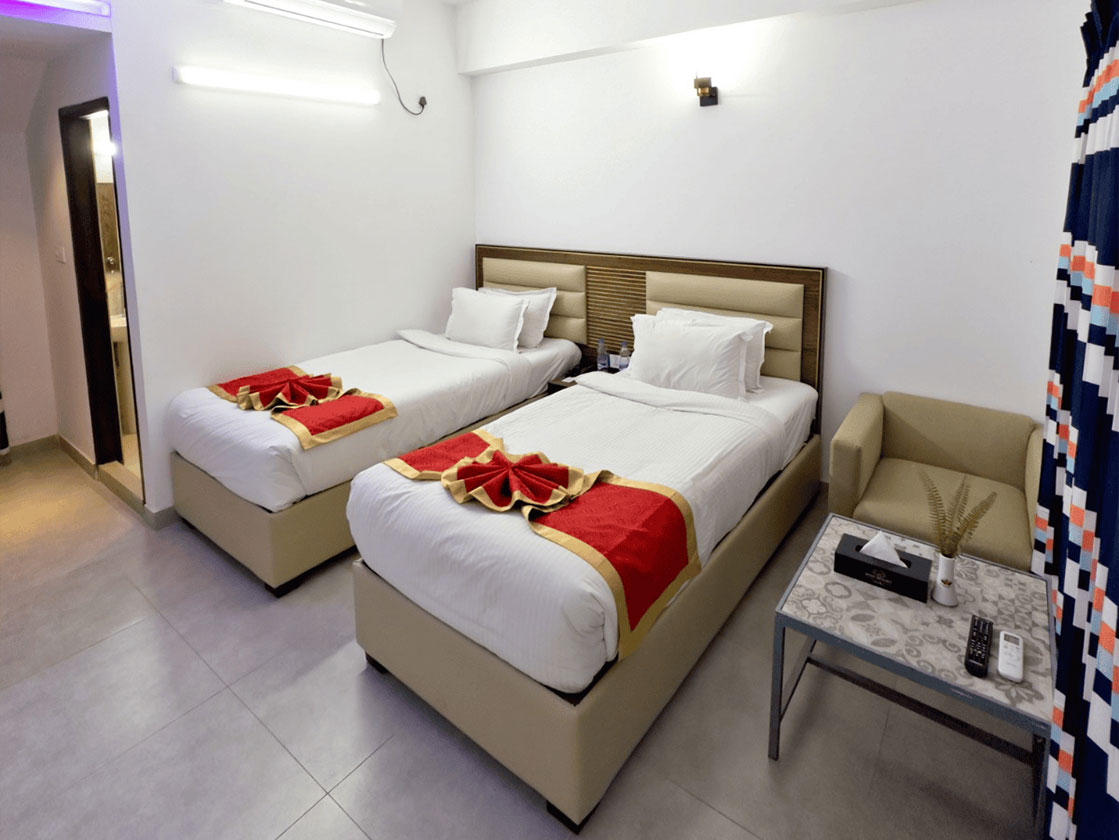 DELUXE ROOM: are contemporary in style and generous in size 180 square feet. Rooms have one king size Divine bed or two individual Divine bed, cozy sofa and table Luggage rack and cabinet. All rooms have with sliding glazed windows, Rooms are facilitated with high-speed internet WIFI connection and flat screen smart LED Television with satellite & cable channels, PABX dialing system, self-controlled air-conditioning, rainfall shower and Signature bathroom amenities.